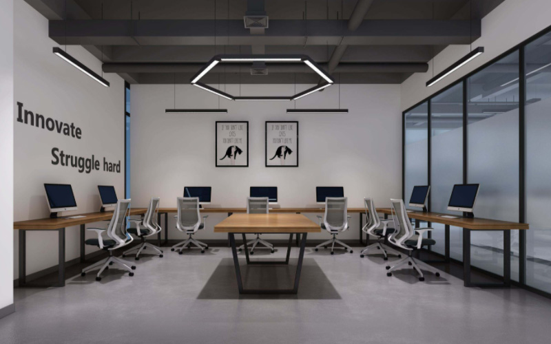 这是一个200平方办公室装修案例,但功能较全,如何才能做到把小空间做出品质来,这是考验设计者的时候,本案设计师伍文突发奇想把空间做成了折纸的形状,创意简单又有效,无论是平面布局还是空间造型,都采用了折线的形式,用硬朗的线条和出乎意料的转折,最大化利用空间。